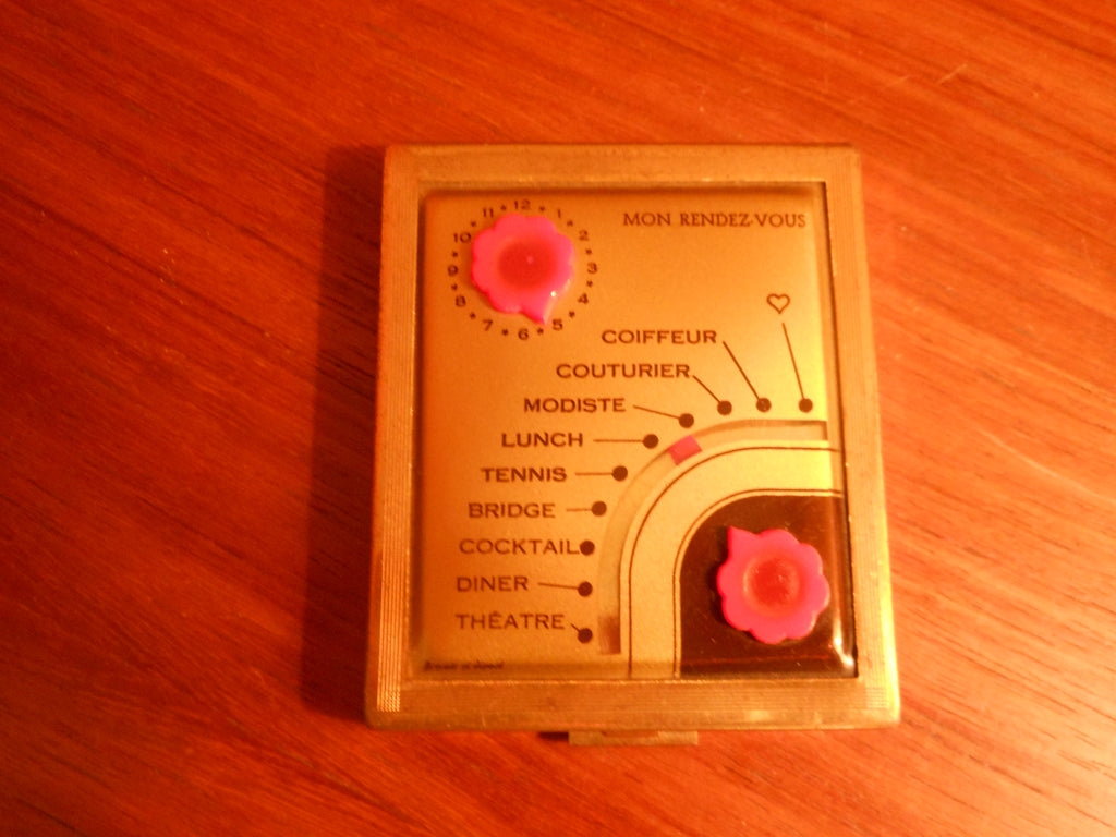 Analog scheduler! Mon rendezvous compact allows you to indicate time of appointment and select activity. Theater, dinner, cocktails, bridge, tennis, lunch, modiste, courturier, coiffeur. In vintage condition. 3.5" x 3"