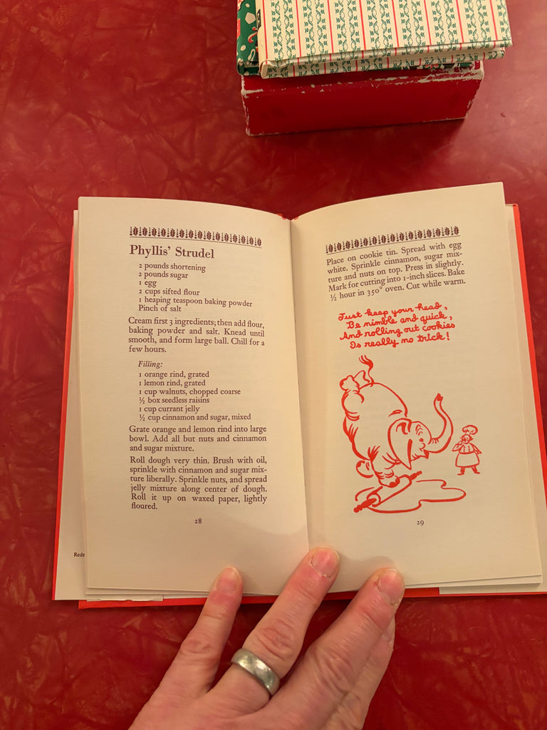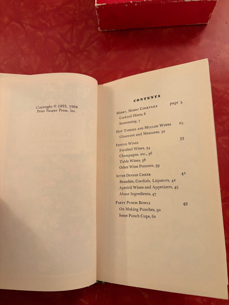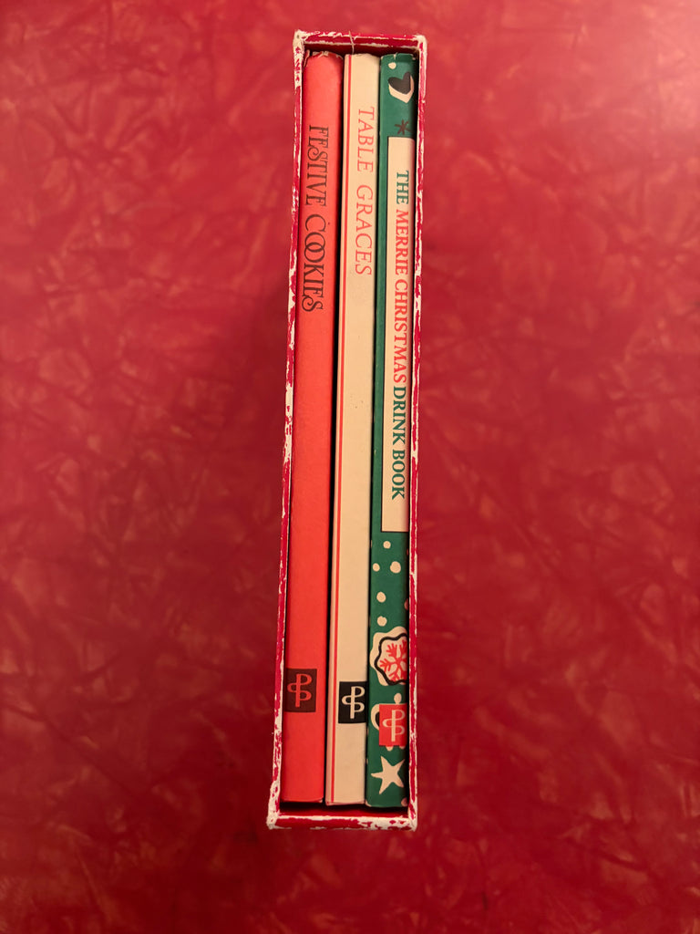 Lovely box set of Peter Pauper Press holiday books. The drink book was originally published in 1955 and reprinted in the mid 80's. I'm not sure about the other two books. The set includes Festive Cookies (1985, 61 pgs.) that contains cookie recipes, Table Graces (1986, 64 pgs.) has graces from the past, for children, for holidays, morning, evening and a new day and The Merrie Christmas Drink Book (1984, 63 pgs.) with recipes for cocktails, toddies, wines, after-dinner and punch. The illustrations and typeset are fantastic. The books are in mint condition with the box showing shelf wear.